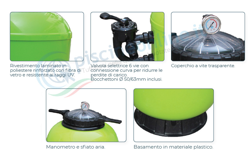Filtri laminati in poliestere rinforzata con fibra di vetro. Superficie liscia con finitura gelcoat verde. Costruiti con materiali resistenti ai raggi UV i filtri sono forniti con valvola